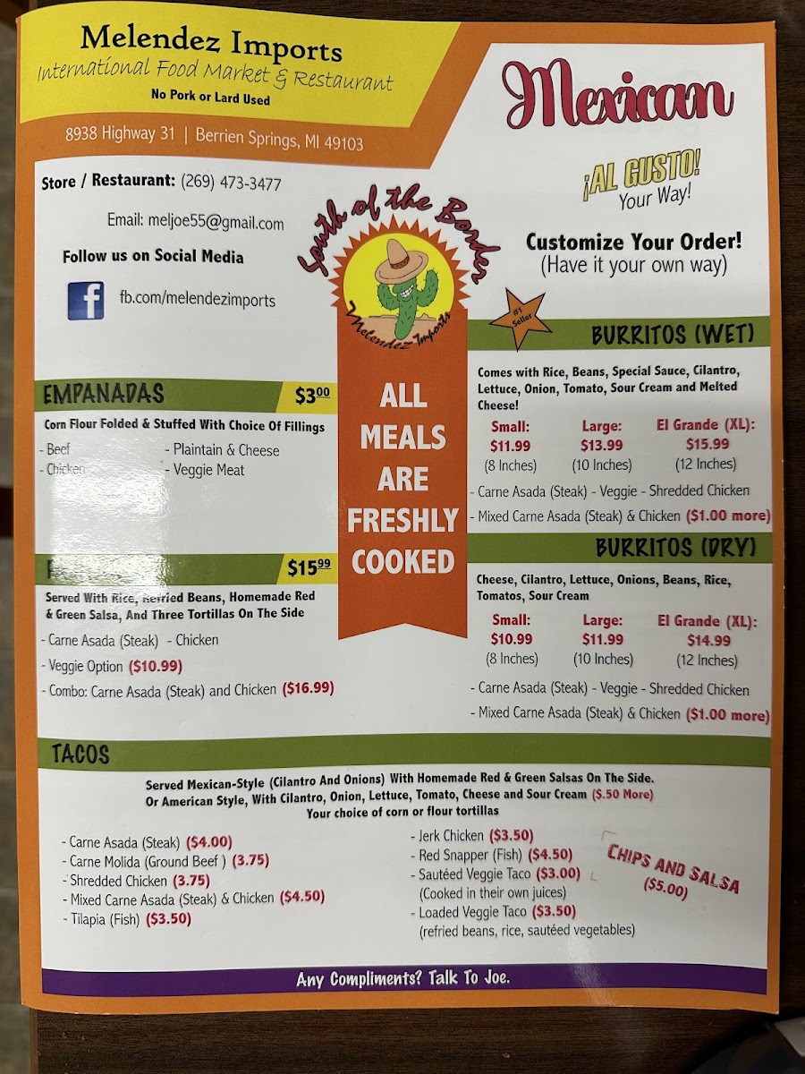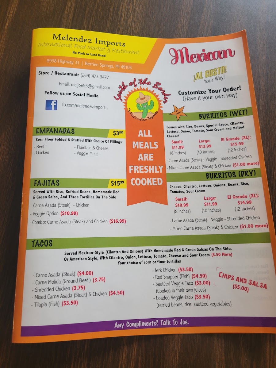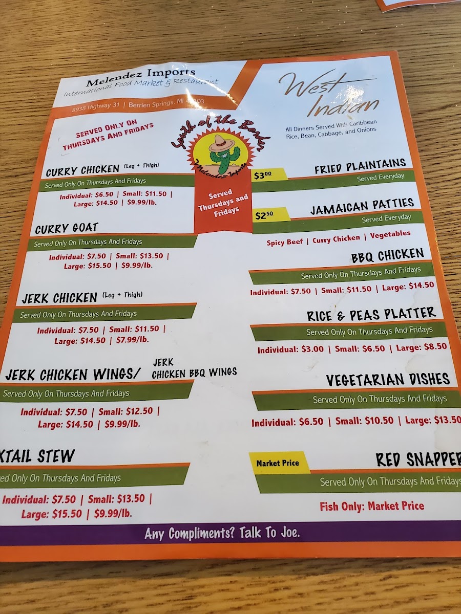 Melendez Imports offers a menu that blends authentic Mexican flavors with Caribbean influences, creating a relaxed dining experience that feels both comforting and familiar. The selection is approachable and diverse, featuring classic dishes like empanadas, enchiladas, and wet burritos alongside options such as jerk chicken and oxtail stew, making it a great spot for casual meals any time of day.